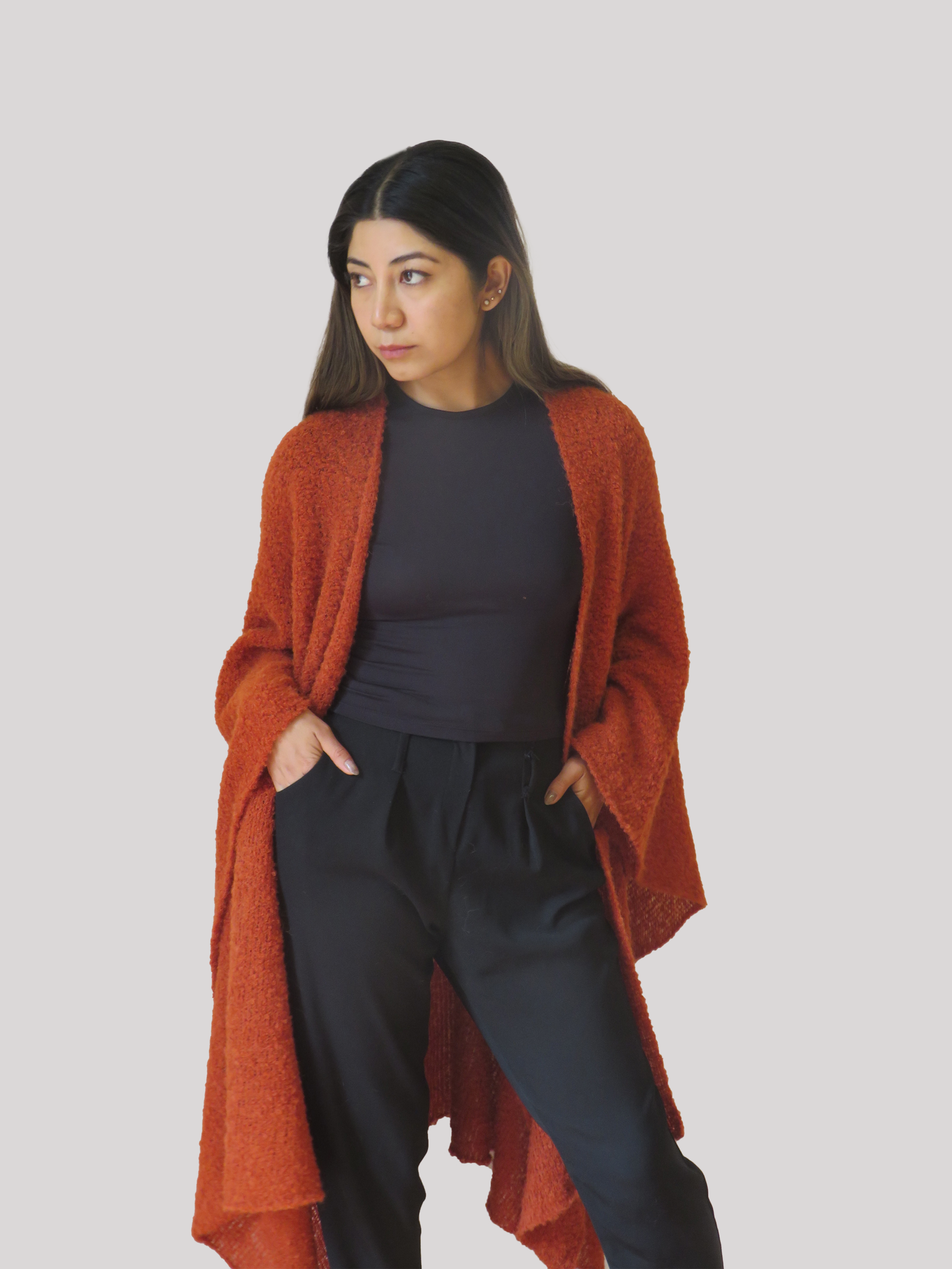 Una prenda cuidadosamente tejida con técnicas artesanales en un diseño innovador en fibra de alpaca
